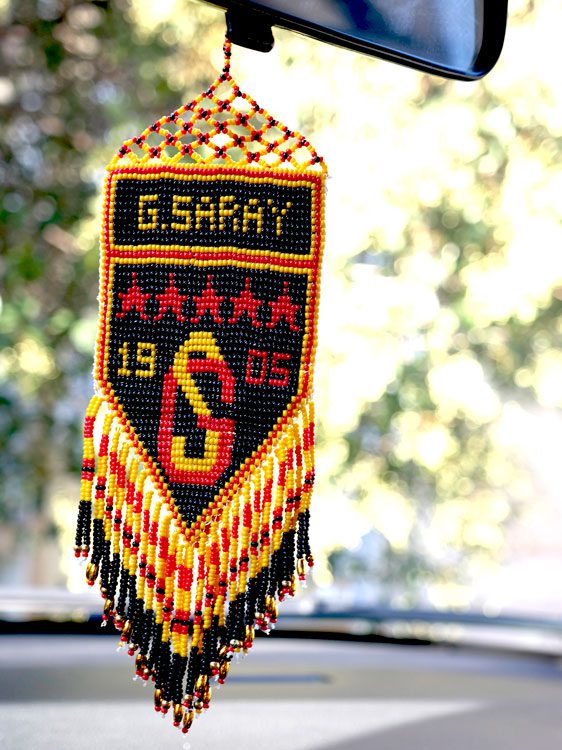 Özenle tasarlanmış bu cezaevi işi araba ayna süsü, taraftarlar için özel olarak üretilmiştir. El emeği göz nuru olan bu ürün, siyah, sarı ve kırmızı boncuklarla işlenmiş olup