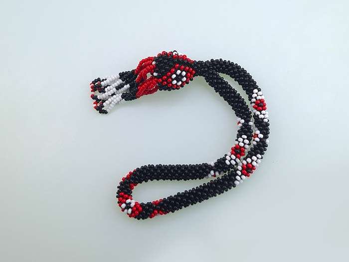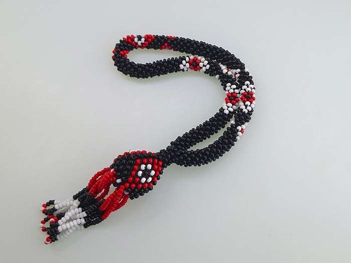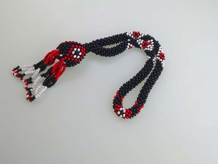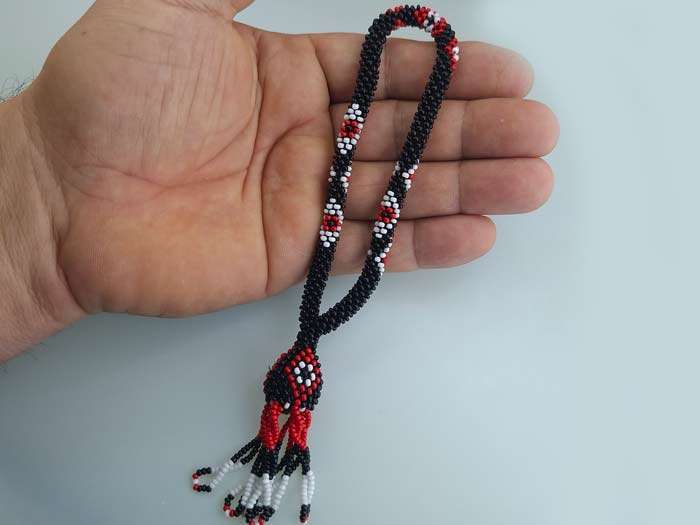 Bu benzersiz salama tesbih, cezaevi ortamında el işçiliği ile özenle üretilmiştir. Tesbihin boncukları siyah beyaz ve kırmızı sallama tesbih renklerin uyumuyla örülmüş olup, zarif ve göz alıcı bir görünüm sunar.