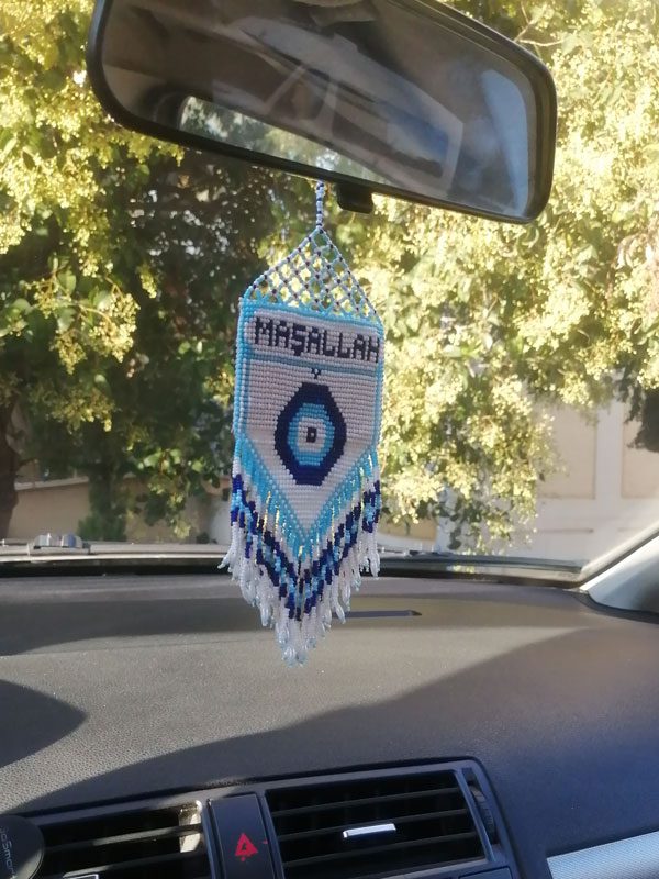 Yolların yorgunluğunu üzerinizden atacak, baktıkça huzur verecek bir detay arıyorsanız bu boncuk örme süs tam size göre. Mavi ve beyazın en güzel tonlarıyla işlenen bu model, her türlü araç içi döşemesiyle mükemmel uyum sağlar.